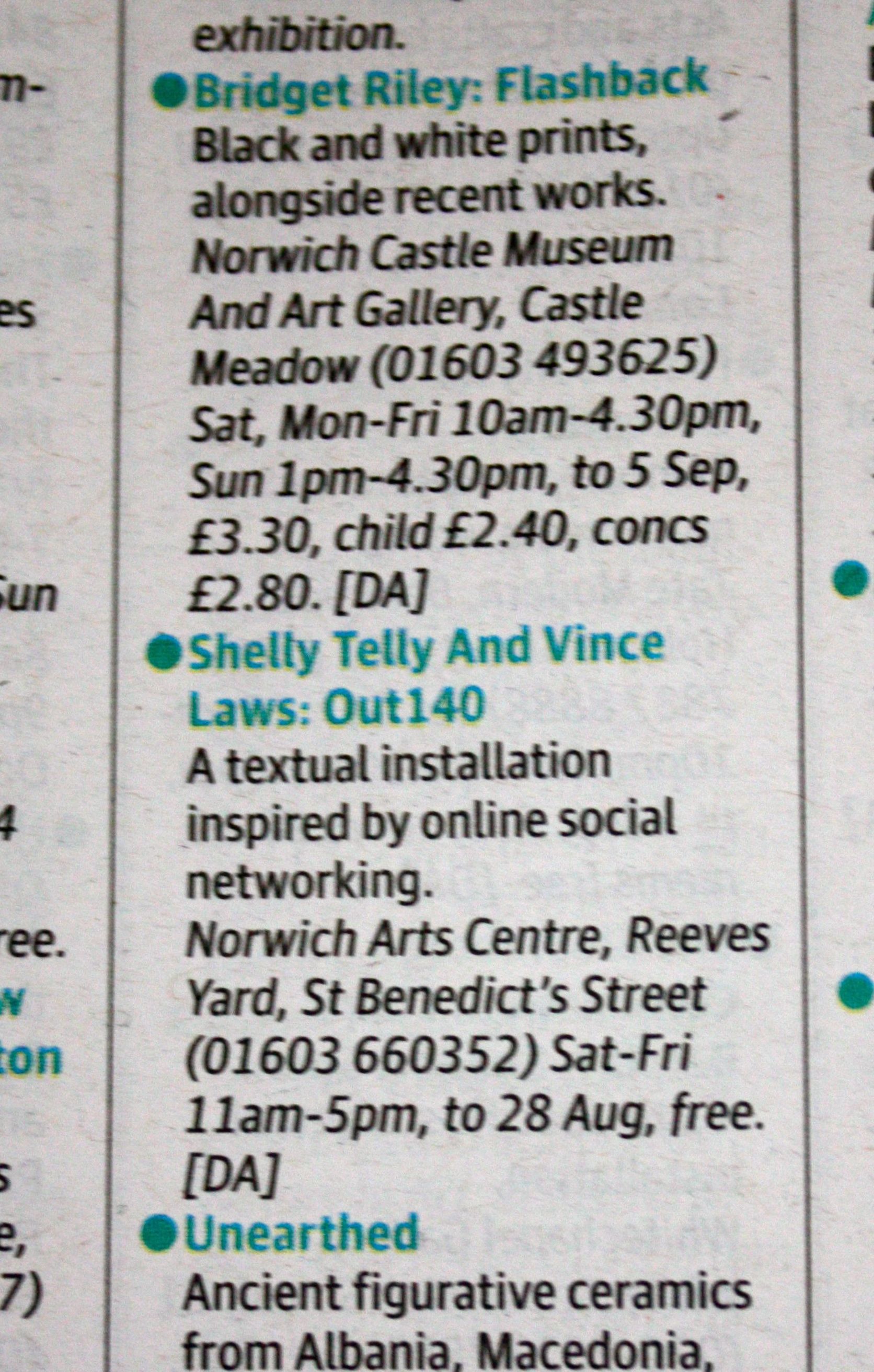 We were very excited to see our OUT140 exhibition listed in the Guardian’s The Guide, just beneath a Bridget Riley exhibition!