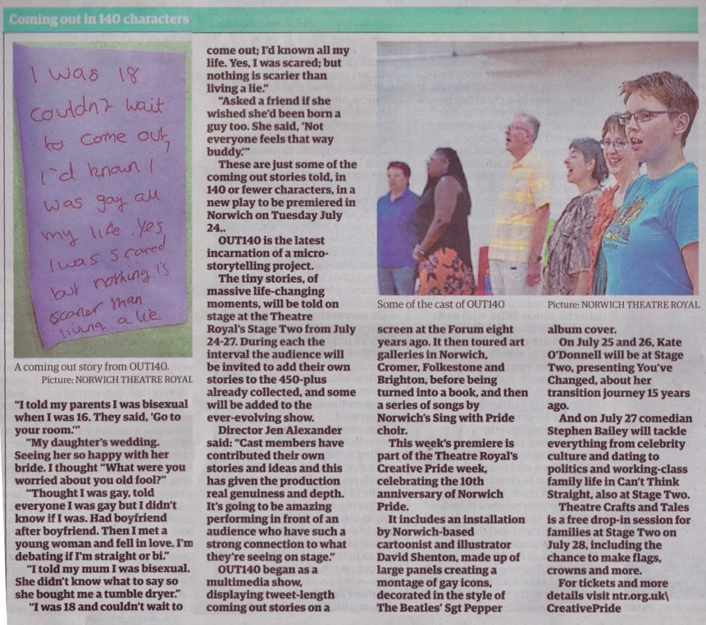 This article in the Norwich Evening News on 26th July 2013 is about Sing with Pride’s “micro-concert” of OUT140 songs.