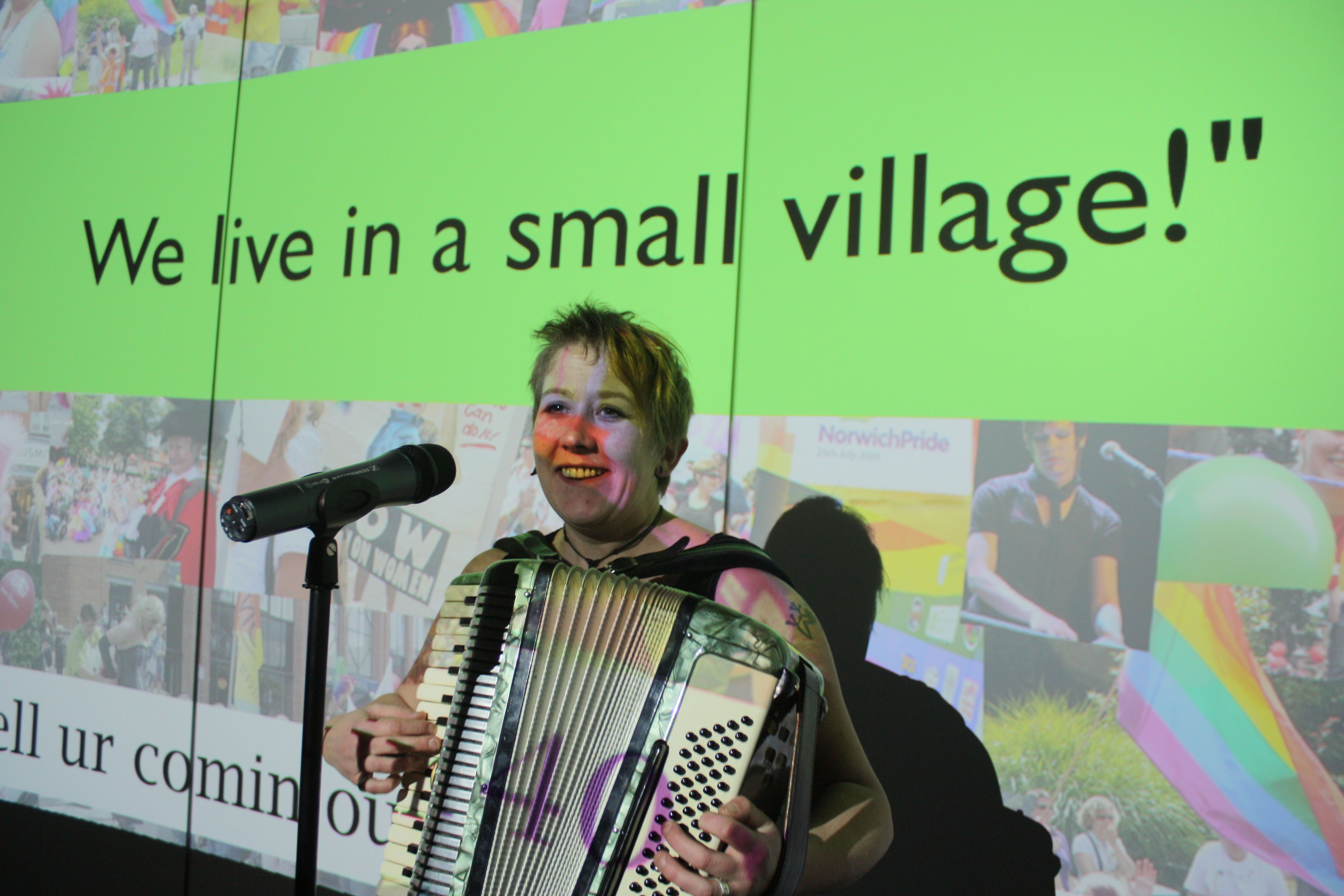 Sing with Pride have worked with a range of singer songwriters to create their OUT140 Suite. Stephanie Anderson wrote the very first OUT140 song Grandma Says. Kimberley Moore wrote Bisexual and Don’t Hold Your Breath. Mary Lovett wrote I Tell Everyone I’m Gay, Irish Working Class Mother, I Had A Boyfriend and worked with Richard Emms to create I’m not Straight. Mary Benefiel wrote the Micro-Opera and I came out to my friends and my family. Mike Yarde wrote I was 18 and Queer Way. Stevie Savage wrote Tick Box. Sue Lane wrote My daughter told her granny and I’ve never come out.
